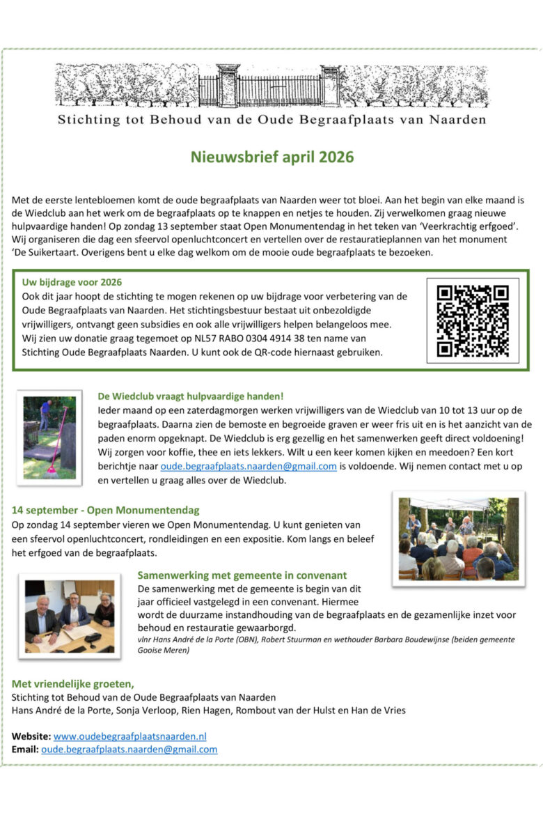Vind hier onze laatst verstuurde nieuwsbrief. Wilt u voortaan de brief in uw mailbox ontvangen, stuur dan een bericht naar info@oudebegraafplaatsnaarden.nl.